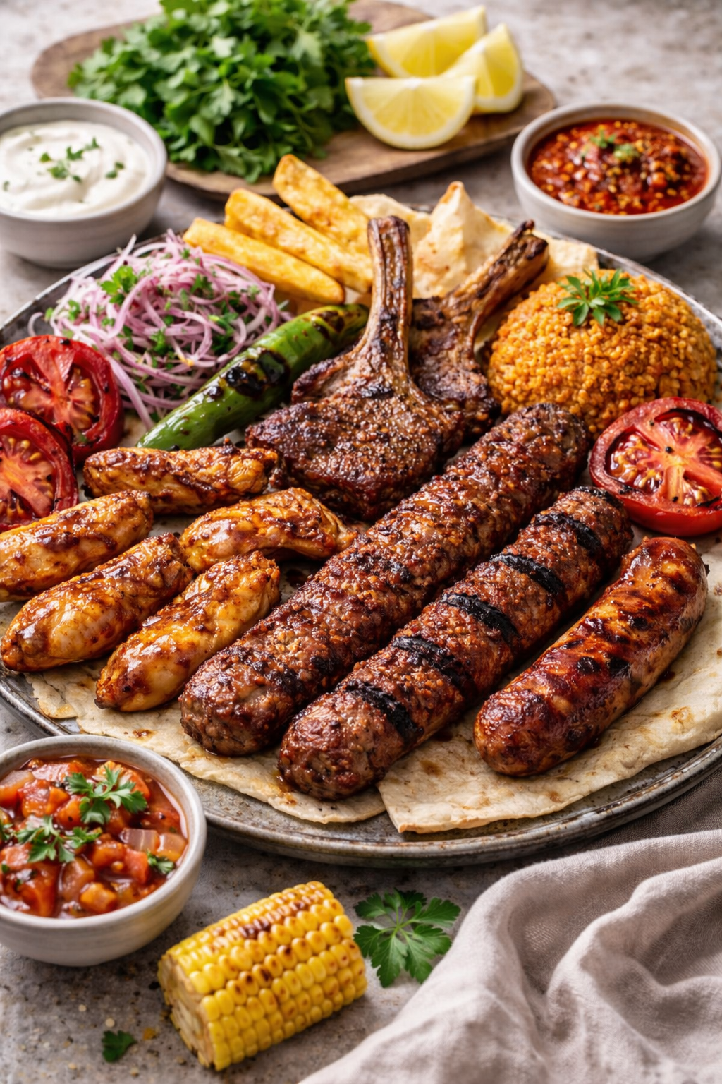 Türkischer gemischter Grillteller mit Sauce, Reis oder Pommes dazu Salat