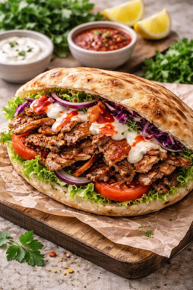 im dünnen Fladenbrot, mit knackigem Salat und hausgemachter Sauce.