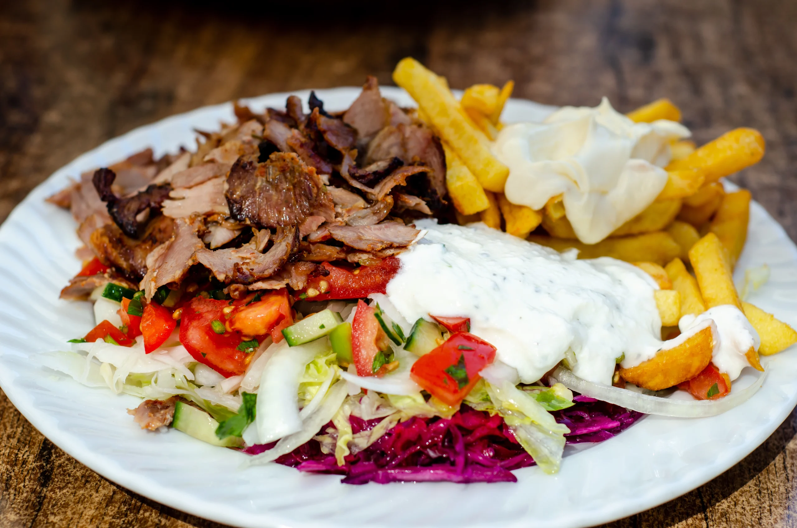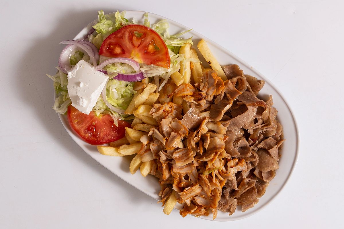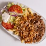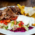 Steak-Dönerteller mit Sauce, Reis oder Pommes dazu Salat
